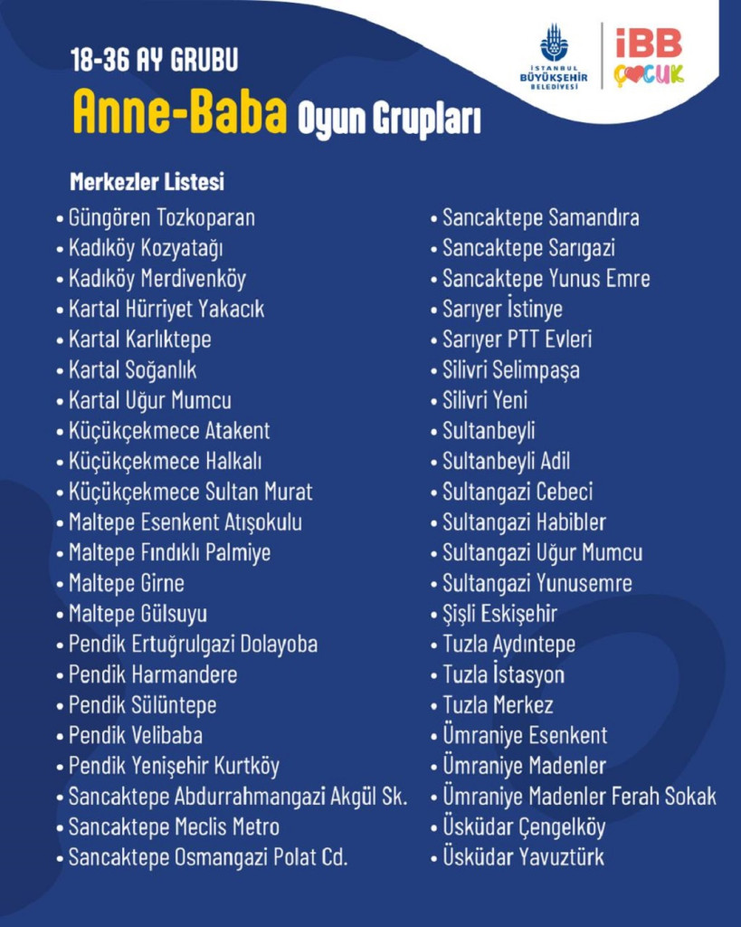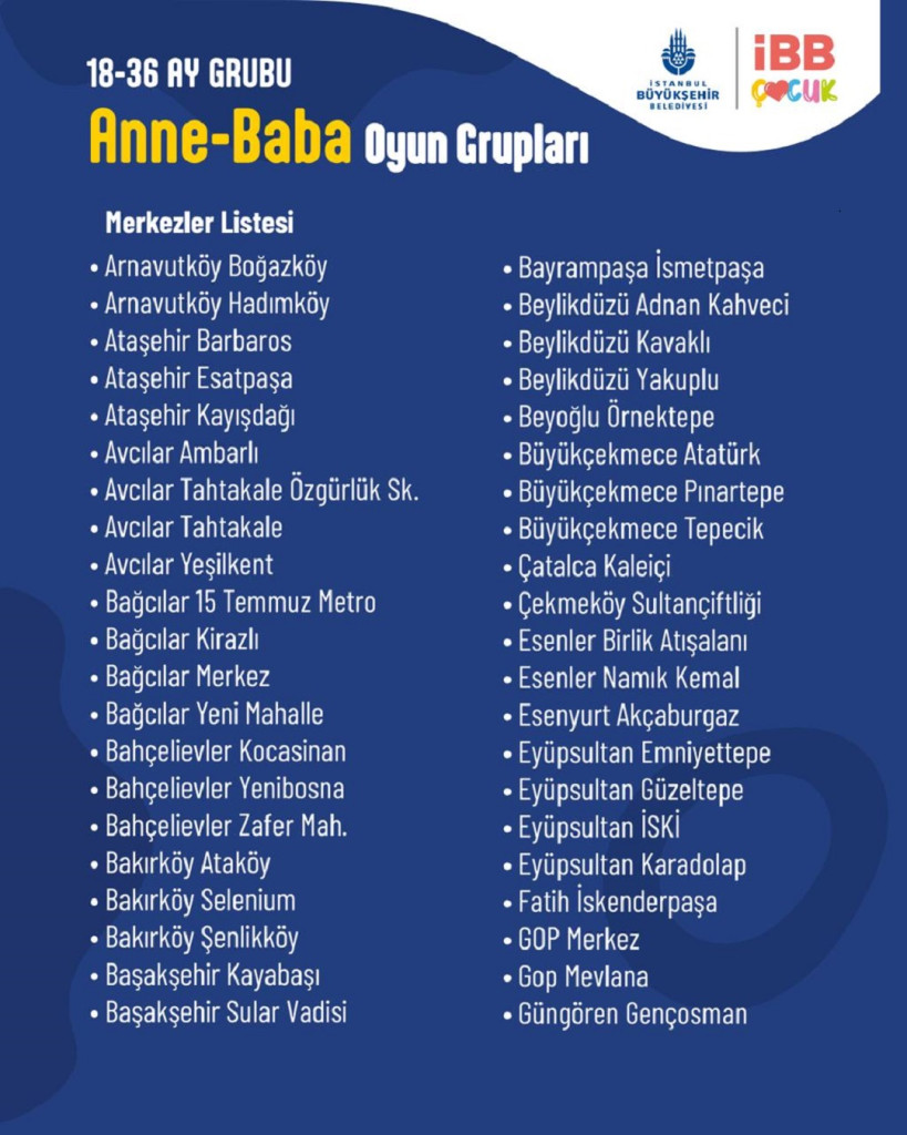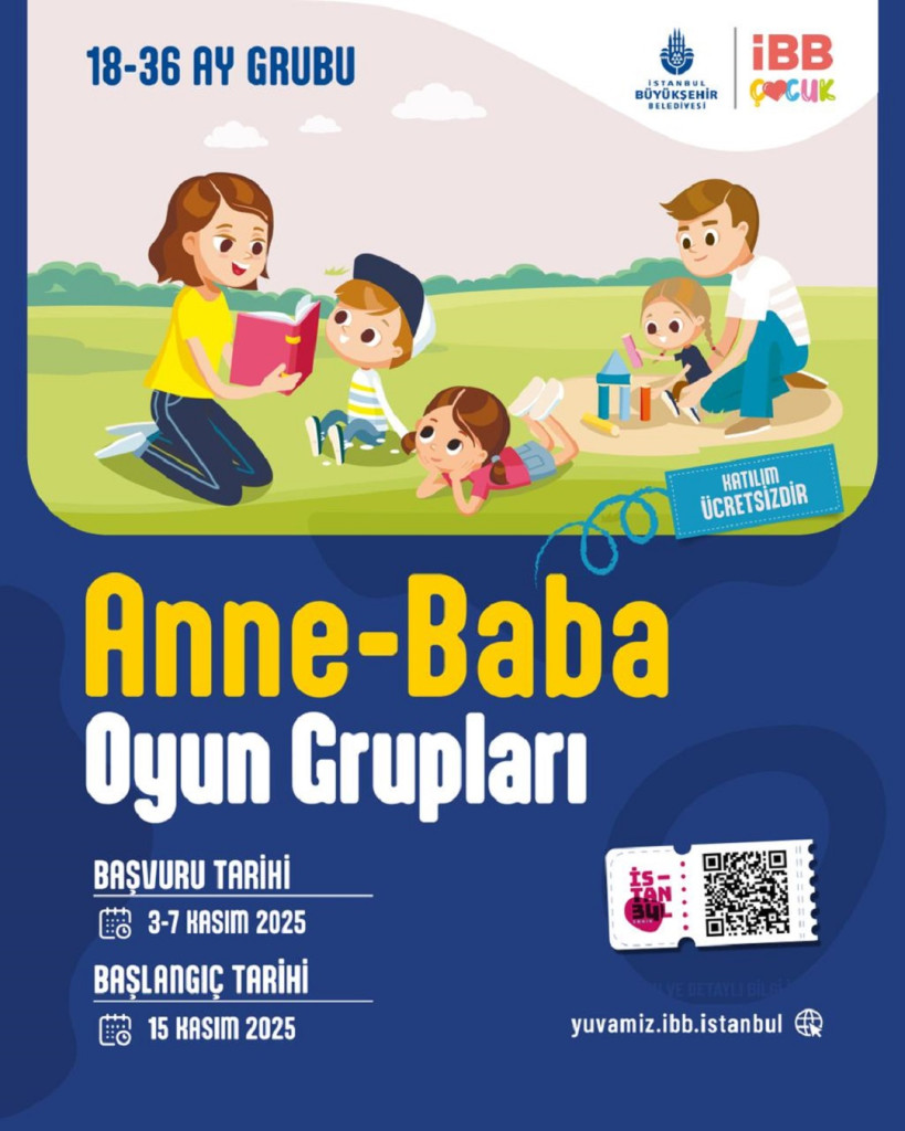 İstanbul Büyükşehir Belediyesi (İBB) Sosyal Hizmetler Dairesi Başkanlığı Çocuk Hizmetleri Şube Müdürlüğü tarafından yürütülen ‘Anne-Baba Oyun Grubu Hizmeti’ için başvurular, 03-07 Kasım 2025 tarihleri arasında alınacak.