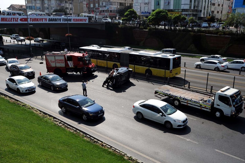 Okmeydanı E-5 üzerinde kontrolden çıkan bir araç bariyerlere çarparak takla attı. Kaza nedeniyle yolun iki şeridi trafiğe kapatılırken, Mecidiyeköy yönünde uzun araç kuyruğu oluştu.
