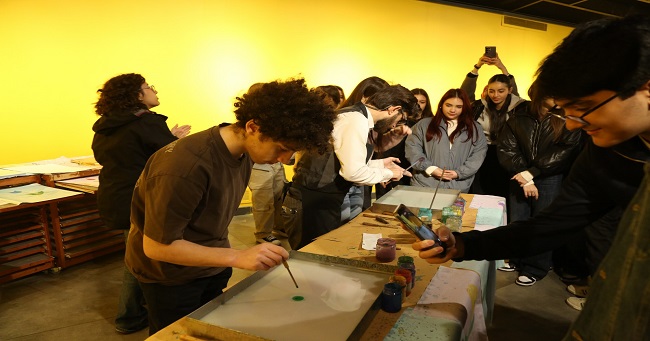 Galeri Eyüpsultan’da çağdaş sanatın öne çıkan isimlerini buluşturan “Sonsuzluk ve Ötesi” sergisini gezen öğrenciler, tur kapsamında ayrıca Ebru atölyesine katılma fırsatı buluyor. Geleneksel Türk sanatlarının en önemli dallarından biri olan Ebru sanatıyla tanışan gençler, kendi eserlerini oluşturarak unutulmaz bir deneyim yaşıyor.