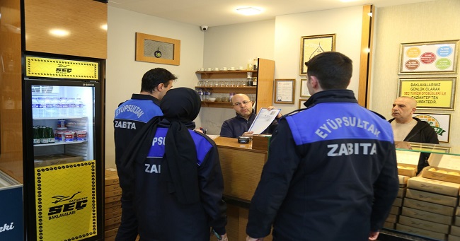 Eyüpsultan Belediyesi Zabıta Müdürlüğü ekipleri, ilçe genelinde denetimlerini sürdürüyor. Ekipler Ramazan Bayramı öncesi, vatandaş sağlığını tehdit edecek bir duruma sebebiyet vermemek için gıda ürünleri üzerinde denetimlerini yoğunlaştırdı. Denetimlerde özellikle tatlı çeşitleri ve baklava çeşitleri imalatı ile satışını yapan işletmelere ağırlık veriliyor.