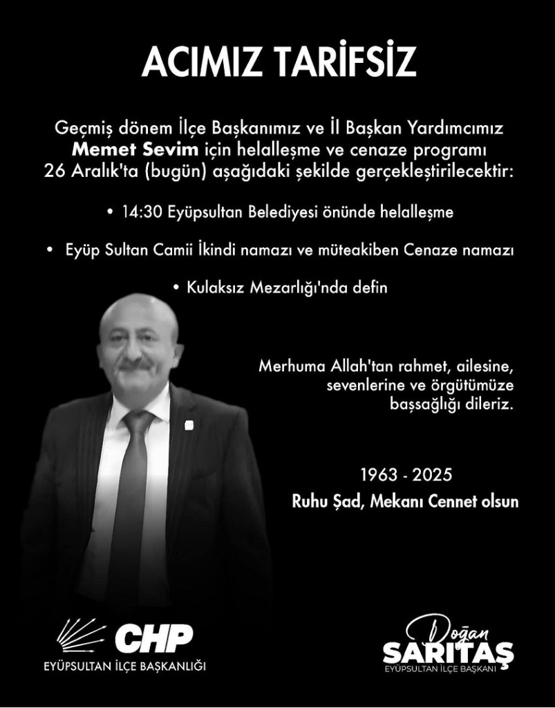 Öncelikle aramızdan derin izler bırakarak ayrılan sevgili yol arkadaşım Cumhuriyet Halk Partisi (CHP) ve Sosyal Demokrat Halk Partisi (SHP) de İlçe Başkanlığı CHP’de İl Başkan Yardımcılığı ve Geçmiş dönem CHP Eyüp Belediye Meclis Üyeliği görevinde bulunan Memet Sevim’e Allahtan Rahmet diler, kederli Ailesine sevenlerine ve yol arkadaşlarına Baş sağlığı ve sabırlar dilerim. Işıklar yoldaşı olsun.