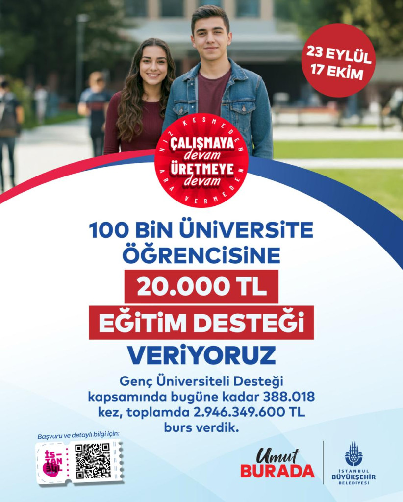 İBB’nin üniversiteli öğrencilere verdiği ‘Genç Üniversiteli Eğitim Desteğine” başvurular 23 Eylül’de başlıyor. Eğitim desteğiyle, 100 bin öğrenciye 20 bin TL’lik maddi katkı sunulacak. Bu yıl toplam 2 milyar TL’lik destek sağlanmış olacak. Başvurular, 17 Ekim 2025 Cuma gününe kadar devam edecek.