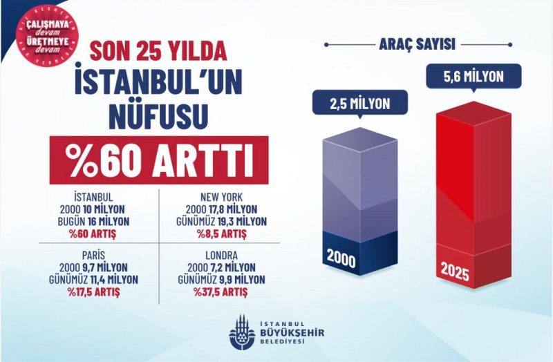 İstanbul’un büyüyen yüküne de dikkat çeken Aslan, 2000 yılında 10 milyon olan nüfusun 2025 itibarıyla 16 milyona ulaştığını, artış oranının yüzde 60 olduğunu söyledi.
