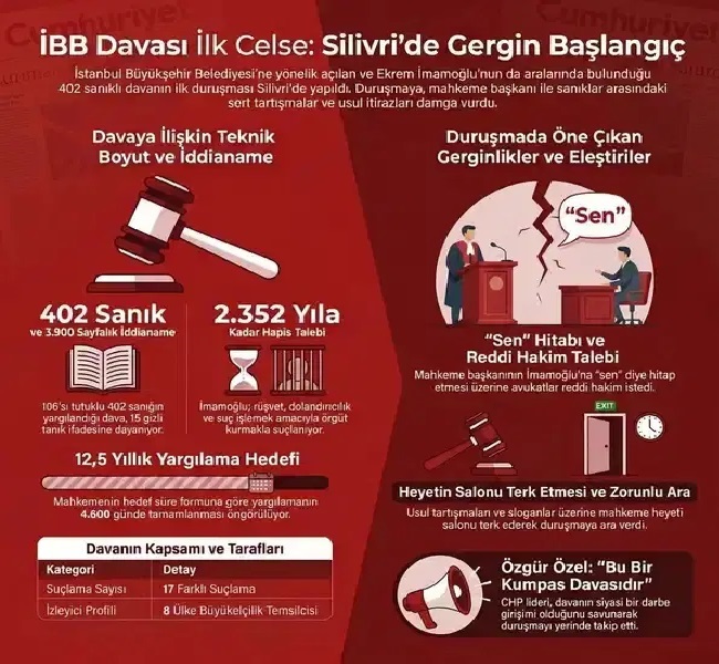 İBB’ye yönelik operasyon kapsamında, yaklaşık 3 bin 900 sayfalık iddianame ile açılan ve aralarında İBB Başkanı Ekrem İmamoğlu’nun da bulunduğu 106’sı tutuklu 402 sanıklı davanın ikinci celsesi bugün görülecek. İşte İBB davasının ikinci gününde anbean yaşananlar…