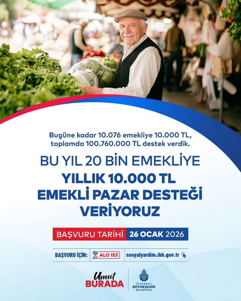 İstanbul Büyükşehir Belediyesi (İBB), artan hayat pahalılığı karşısında geçim mücadelesi veren emeklilere yönelik sosyal desteklerini sürdürmeye devam ediyor. Bu kapsamda hayata geçirilen Emekli Pazar Desteği başvuruları 26 Ocak 2026 itibarıyla başladı. 2026 yılında 20 bin emekliye kişi başı 10 bin TL destek sağlanacak. Başvurular Sosyal ve Ekonomik Destek Programı (SEDEP) web sitesi ve Alo 153 Çözüm Merkezi üzerinden yapılacak.