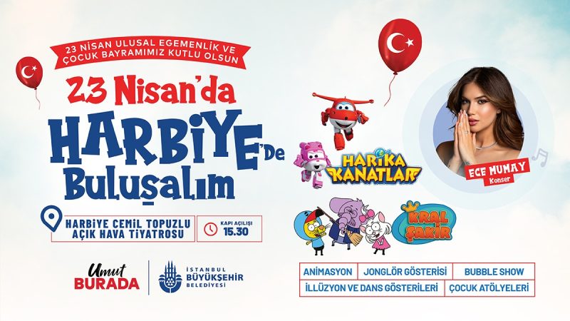 23 Nisan Perşembe günü, Harbiye Cemil Topuzlu Açık Hava Tiyatrosu kapsamlı bir programa ev sahipliği yapacak. İBB İstanbul Çocuk Korosu ile İBB İstanbul Gençlik Halk Dansları Topluluğu’nun yanı sıra Gürcistan, Sırbistan ve Osetya’dan gelen misafir çocukların sahne alacağı buluşmada; Kral Şakir ve Harika Kanatlar çocuklarla bir araya gelecek. Program, saat 19.30’daki Ece Mumay konseriyle devam edecek.