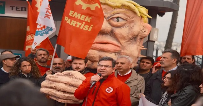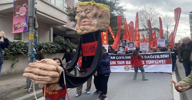 Yürüyüşte Emek Gençliği ABD Başkanı Donald Trump’ı temsilen hazırlanan bir kukla taşıdı. Kuklanın üzerinde “Go home” yazısı yer aldı.