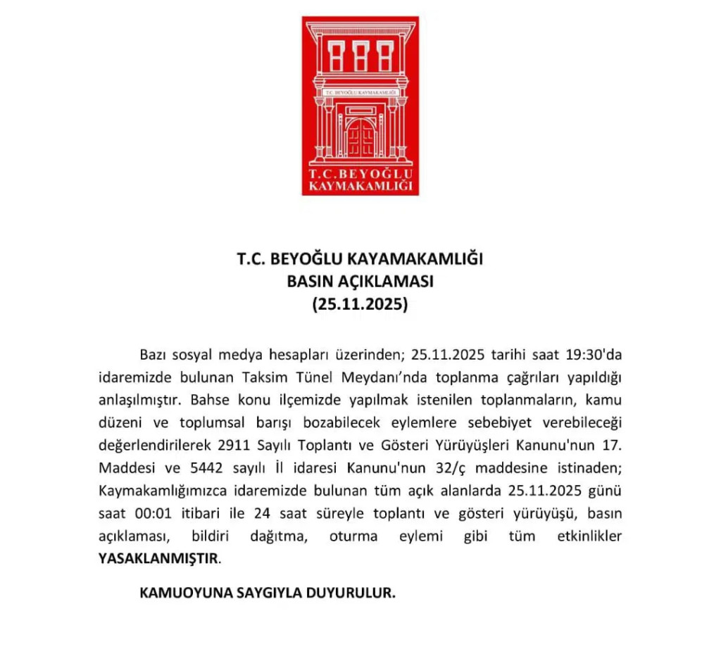 Eylemin başlamasına dakikalar kala Beyoğlu Kaymakamlığı’ndan yasaklama kararı geldi.