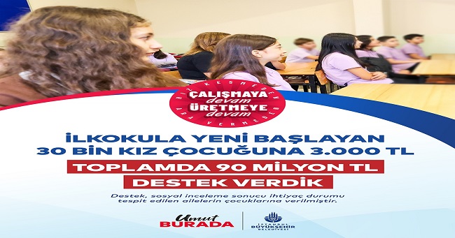 İstanbul Büyükşehir Belediyesi (İBB), eğitimde fırsat eşitliğini güçlendirmek için kız çocuklarının eğitimine yönelik desteğini sürdürüyor. “Kızlar Okusun Diye” projesi kapsamında, ekonomik zorluk yaşayan ailelerin ilkokula kayıtlı kız çocukları için bu yıl 30 bin haneye 3.000 TL tutarında nakdi destek sağlanacak.