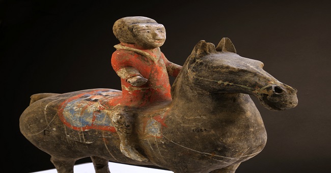 Antik Çin’de hızın, azmin ve gençlik enerjisinin simgesi olan at, aynı zamanda bir statü göstergesiydi. Çin’de at kültürü ve atlara verilen değer, bir ölü gömme ritüeli olarak imparatorlar ve aristokratların atlarıyla birlikte gömüldüğü Shang Hanedanlığı’na (MÖ 1600–1100) kadar uzanıyor. Zamanla bu gelenek, ölen kişinin ardından mezara pişmiş topraktan yapılmış ve “mingqi” adı verilen heykelcikler bırakma ritüeline dönüştü. Tang Hanedanlığı (618–907) döneminde bu gelenek zirveye ulaştı ve at figürleri, ölenleri ölümsüzler diyarına taşıdığına inanılan özel bir anlam kazandı. Koleksiyonda yer alan sırlı veya boyalı pişmiş topraktan yapılmış bu atlar, üretildikleri atölyenin kendine has tarzını yansıtarak dönemin sanatsal zenginliğini gözler önüne seriyor.
