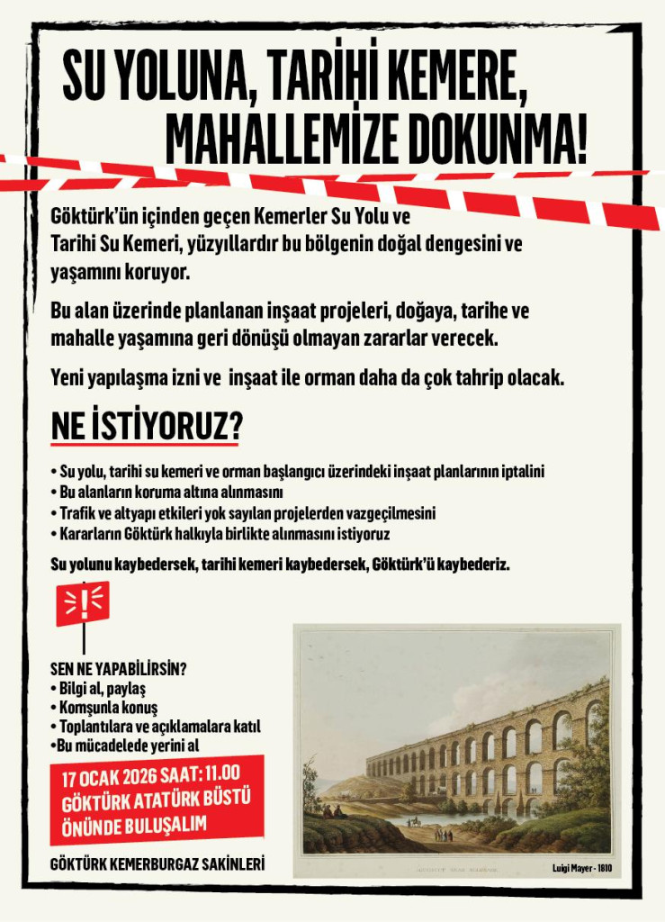 Kemerburgaz ve Göktürk sakinleri olarak, bölgenin tarihini, doğasını ve yaşam alanlarımızı korumak için imar planlarına karşı hukuki mücadelemiz devam etmektedir. Kemerburgaz ve Göktürk mahallesi sakinleri ve komşuları olarak, Tarihi Su Kemerlerinin yanındaki 60.000 metre kare tarla alanının hukuka aykırı şekilde yapılaşmaya açılmasına ilişkin imar planlarının iptal edilmesi için davamızın takipçiyiz.