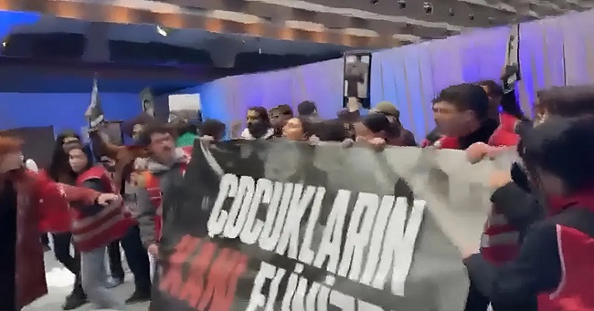 Güvenlik görevlilerinin grubun açtığı pankarta müdahale etme girişimi üzerine TİP’li grup ve güvenlik görevlileri arasında arbede yaşandı.