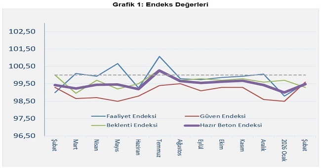 Hazır Beton Endeksi 2026 Şubat Ayı Raporu’na göre Tüm endeksler, 2025 yılının büyük bölümünde eşik değerin altında dalgalı bir seyir izledikten sonra, yılın son çeyreğinde eşik değere doğru sınırlı bir toparlanma eğilimi göstermiş, ancak 2026 ocak ayında bu toparlanma yerini yeniden zayıflamaya bırakmıştır.