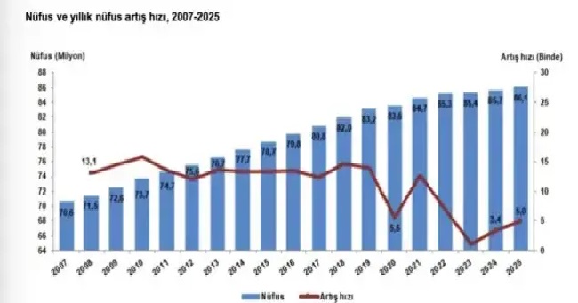 Yıllık nüfus artış hızı 2024 yılında binde 3,4 iken, 2025 yılında binde 5 oldu.