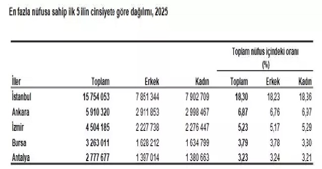 TÜİK Türkiye’nin 2025 nüfusunu açıkladı. Buna göre 2025 yılında Türkiye nüfusu 86 milyon 92 bin 168 kişi oldu. Erkek nüfus 43 milyon 59 bin 434 kişi olurken, kadın nüfus 43 milyon 32 bin 734 kişi oldu.