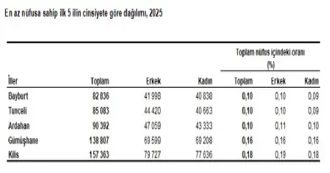 Bayburt, 82 bin 836 kişi ile en az nüfusa sahip olan il oldu. Bayburt’u, 85 bin 83 kişi ile Tunceli, 90 bin 392 kişi ile Ardahan, 138 bin 807 kişi ile Gümüşhane ve 157 bin 363 kişi ile Kilis takip etti.
