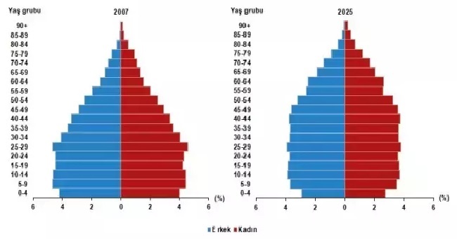Nüfus piramitleri, nüfusun yaş ve cinsiyet yapısında meydana gelen değişimi gösteren grafikler olarak tanımlanmaktadır. Türkiye’nin 2007 ve 2025 yılı nüfus piramitleri karşılaştırıldığında, doğurganlık ve ölümlülük hızlarındaki azalmaya bağlı olarak, yaşlı nüfusun arttığı ve ortanca yaşın yükseldiği görülmektedir.